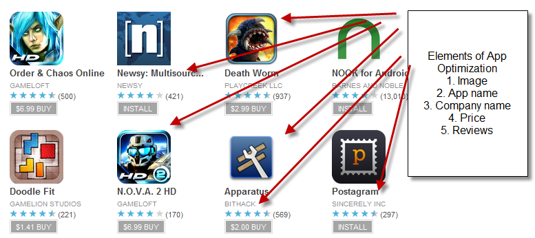Google Play and Apple’s App store place apps in search results based on a mix of ranking factors including the application title, screenshots, tags, rating, etc., so make sure these factors are optimized for search results.