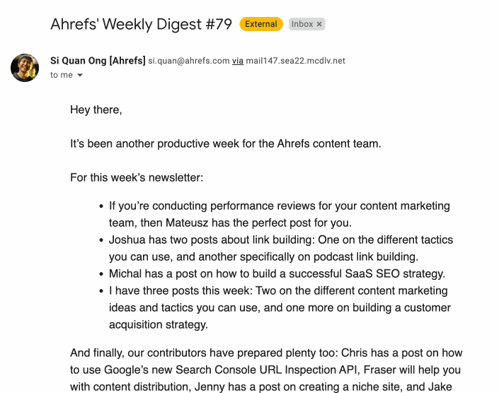 Ahrefs offers SEO products to help businesses optimize their web presence, from link building to keyword research. They have a strong blog property and their weekly newsletter is a roundup of their top blog posts.
