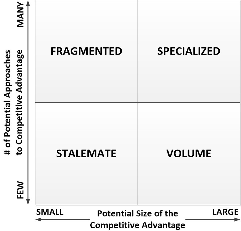 This matrix has two axes — vertical and horizontal. The vertical axis evaluates the number of opportunities available for achieving a competitive advantage, while the horizontal axis measures the potential size of the competitive advantage.