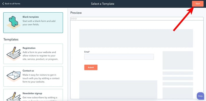 4. Select Blank template to start with a blank form, or a pre-made template for a specific use case. Once you've selected your template, click "Start".