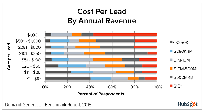 Companies with higher annual revenues tend to pay a higher cost per lead. However, companies with between $250,000 and $10 million in revenue all average a cost per lead of $26-$50.