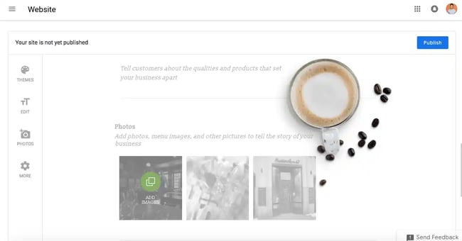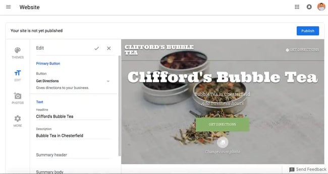 Google’s website builder will automatically generate an initial website for you, pre-populated with your business’ name, location, hours, contact information, posts, catalogue, and photos.
