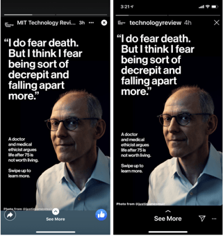 Recently, MIT Tech Review uploaded and posted the same story about aging on Facebook and Instagram. (Facebook is to the left and Instagram is on the right.)