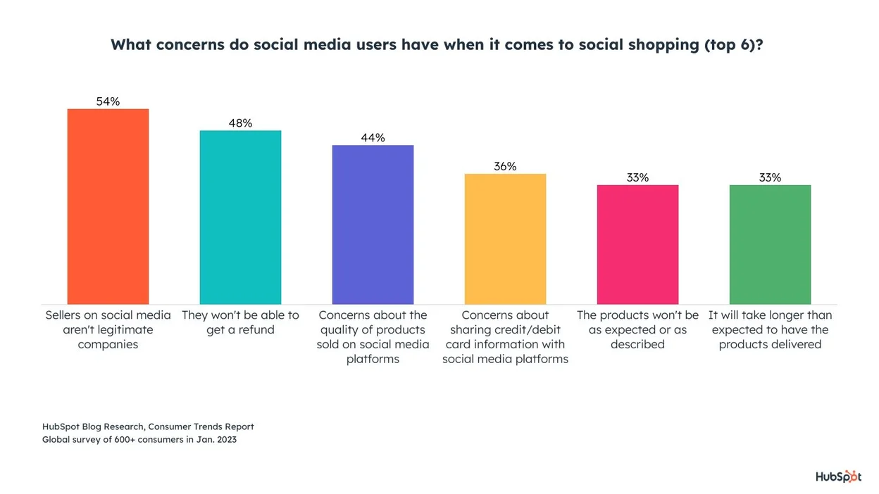 - Trust is a big factor for social shopping among social media users, as 54% are concerned that they companies selling on social media aren’t legitimate. (HubSpot, 2023)