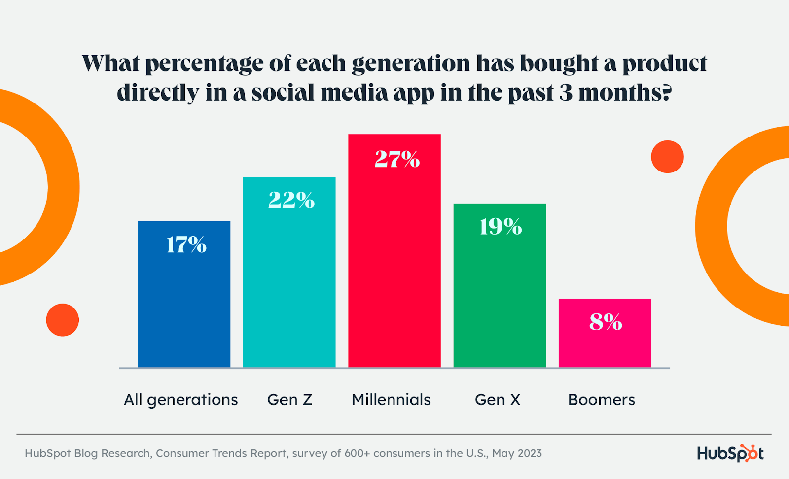 - Over 1 in 5 Gen Z, Millennial, and Gen X social media users bought a product directly in a social media app in the past 3 months. (HubSpot, 2023)