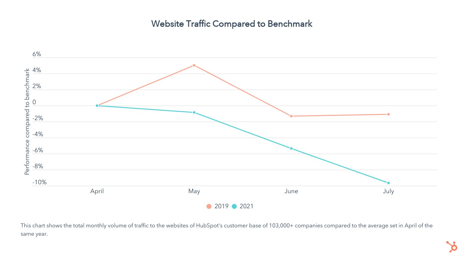In June 2021, global traffic dipped across almost all industries and segments. Compared to 2019, websites also saw less overall traffic growth. This dipping continued throughout the summer, while 2019 saw traffic slump level out by that point in the season.