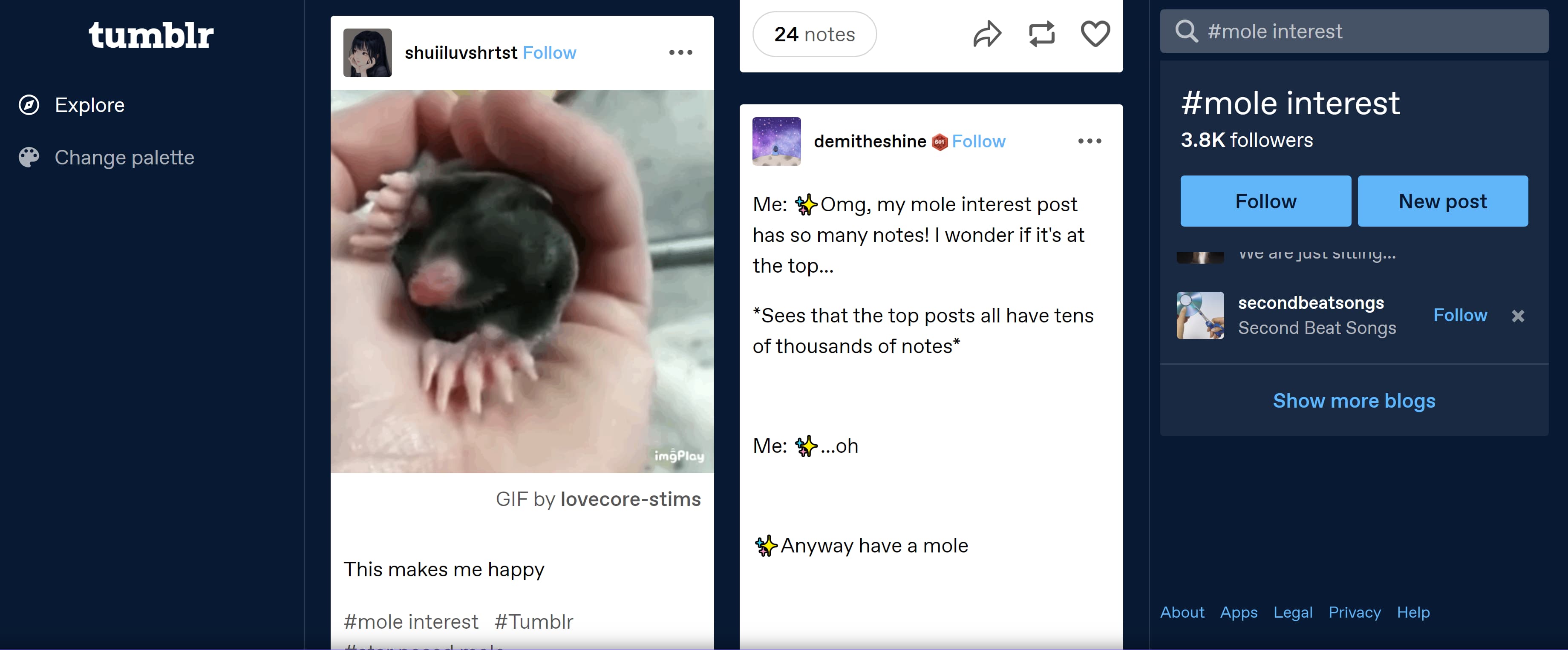 The random words were "mole" and "interest," and, sure enough, "mole interest" became a Tumblr trending topic.