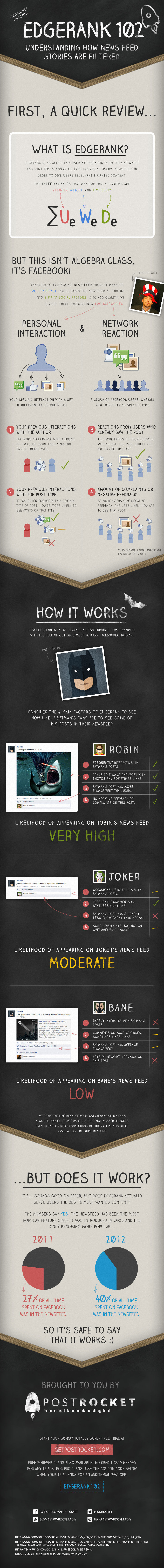 Well, a new infographic from PostRocket will clear that right up, helping you understand exactly what factors contribute to how News Feed stories get filtered and displayed to a given user -- in a very easy-to-understand, non-mathy way ... with Batman-themed examples. Check it out below for a simple explanation of how EdgeRank impacts the content you post to your Facebook Page.