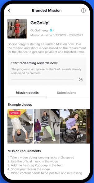 For starters, advertisers will need to check off the requirements for their Branded Mission. This includes pairing the Branded Mission with a Branded Hashtag Challenge or Branded Effect, as well as other more specific requests like "lip sync with music" or "change your outfit".
