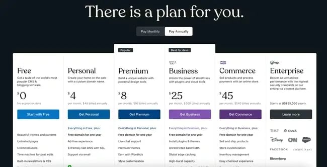 WordPress.com offers several plans that vary in price: Personal ($9/month or $4/month if paid annually), Premium ($18/month or $8/month if paid annually), Business ($40/month or $25/month if paid annually), and Commerce ($70/month or $45/month if paid annually). There’s also enterprise available, which starts at $25,000 a year.