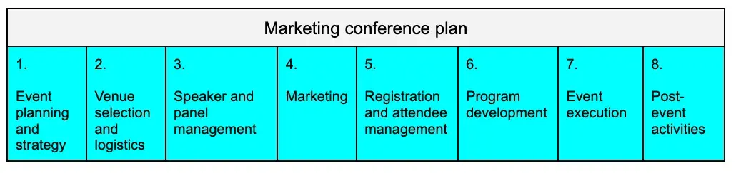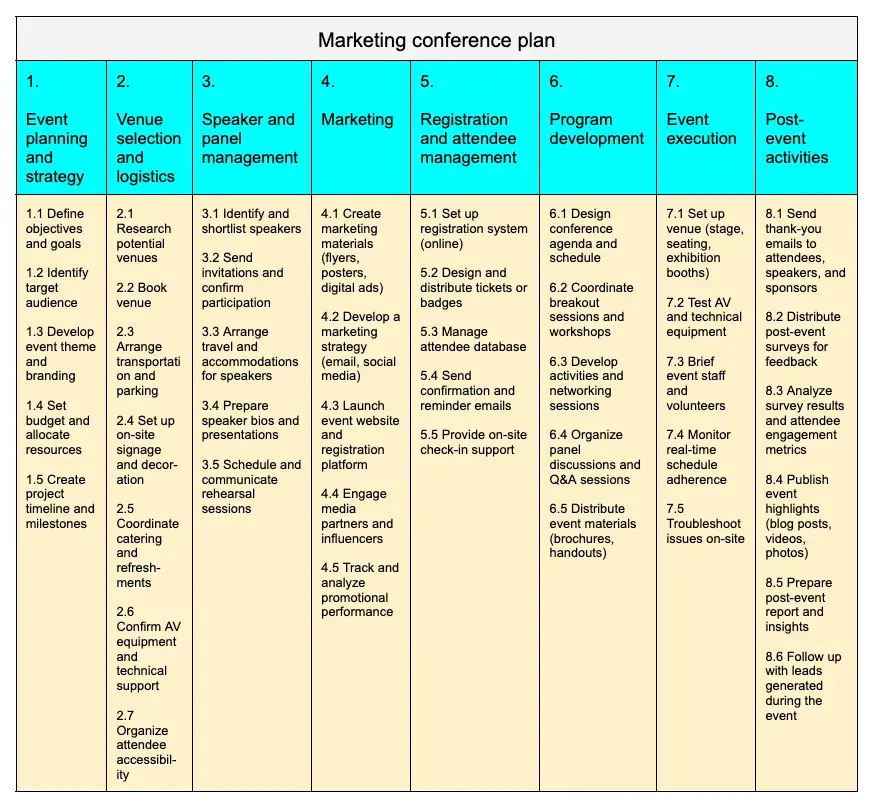 The top level of the WBS covers the entire project scope. It’s also the final deliverable, which outlines what I want to accomplish. For this project, the top level is a “marketing conference plan.”