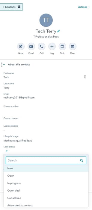In addition to the lifecycle stage, tracking the lead status for contacts who can be classified as sales qualified leads can provide insightful data to your CRM record. Here are the lead status options in HubSpot CRM: