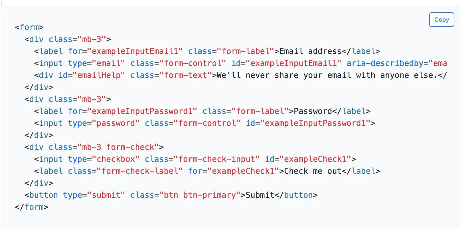 Bootstrap’s own example of a login menu is straight to the point. It’s a great starting point for building your own sign-in page. Conveniently, you can copy the code from Bootstrap by simply pressing the “Copy” button in the corner so you can paste it into the backend of your website — and modify it as you see fit.