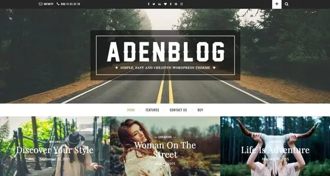 Aden is a simple and clean theme for bloggers. In addition to offering custom backgrounds, live color options, and breadcrumb navigation, Aden has a static layout and header that's ideal for static websites.