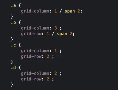 Here's the same CSS from the example above rewritten using the span keyword. Items A and B span two columns and two rows respectively, so the end value is "span 2." Note that many properties are only defined by one value. In that case, the default of spanning one column or row is assumed.