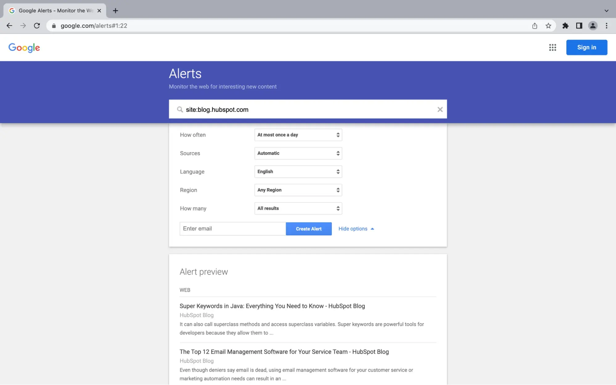 Google Alerts does not track one specific website by default. Instead, it will search the entire web for the freshest updates on the topic you specified. You can use a company name, a trend, a general name of a particular industry, etc.