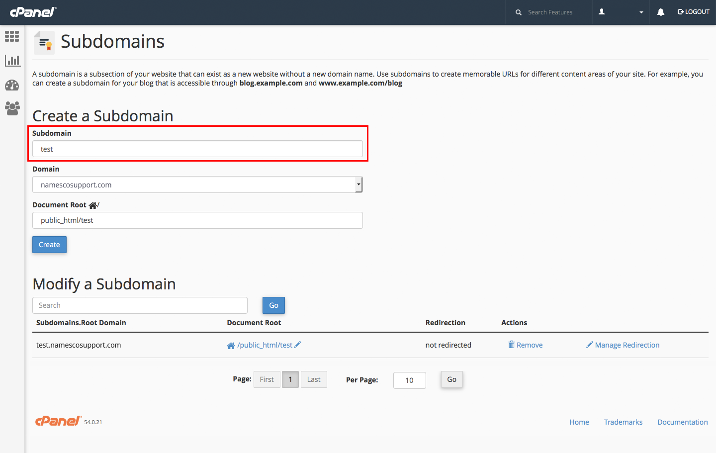 Now I’ll navigate to Subdomains or Add Subdomains. Here I can begin to enter my subdomain of choice. I add the subdomain, and make sure my primary domain name is selected as well.